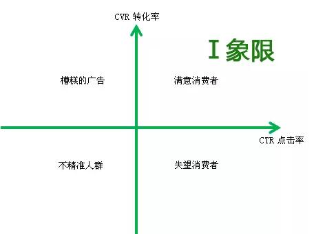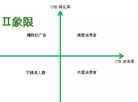 第Ⅰ象限:转化率高,点击率高。满意消费者。可以简单的理解为很多人点广告,也很多人咨询。说明网民比较容易看到广告,也比较愿意点击这条广告,加上咨询的人比较多,进一步说明“对的信息传递给了对的人,对的人找到了他要的信息”。