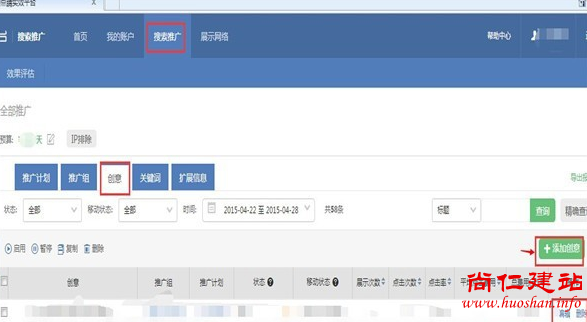 1.点击【搜索推广】栏目下,选择【创意】,右边点击【添加创意】。为每个推广组添加创意,创意就是内容,介绍产品或是业务服务等 。创意是整个账户的重点,推广是否能够吸引更多点击进入账户浏览,就要看创意写得是否新颖。