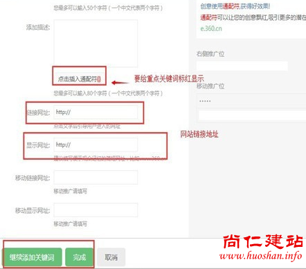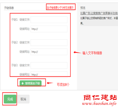 输入显示链接(展现在推广位置的下方),链接地址(点击进入的页面链接,一般可是是首页,或是其他服务,产品内页)。点击保存即可。