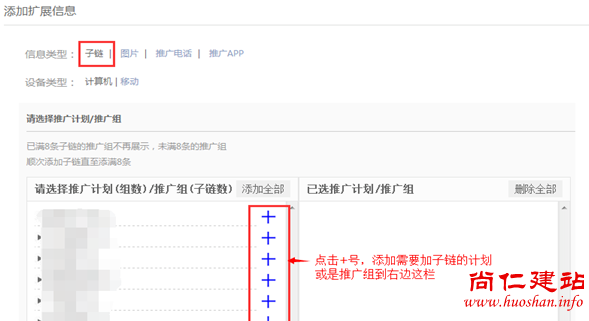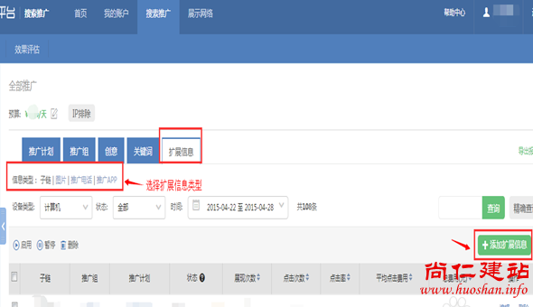 1.下面是介绍添加扩展信息操作步骤,扩展信息有四种类型,点击【扩展信息】,选择需要添加是子链,图片,推广电话,推广app,右边点击添加。
