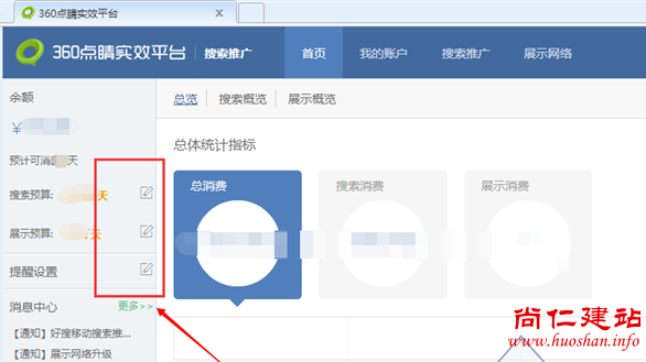 1.在后台推广页面当中,点击首页,在左边可以直接点击编辑修改账户预算。可以直观查找每天的展现和点击。