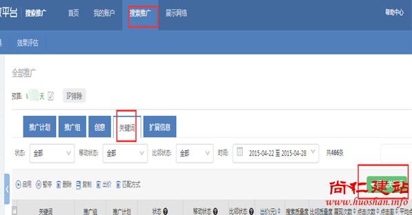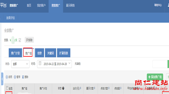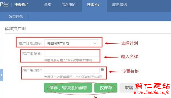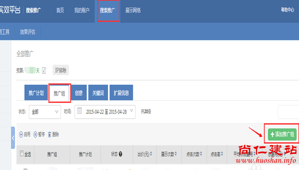 1.选择【搜索推广】,点击【推广组】栏,给每个推广计划添加推广组,即是二级栏目,右边点击【添加推广组】。