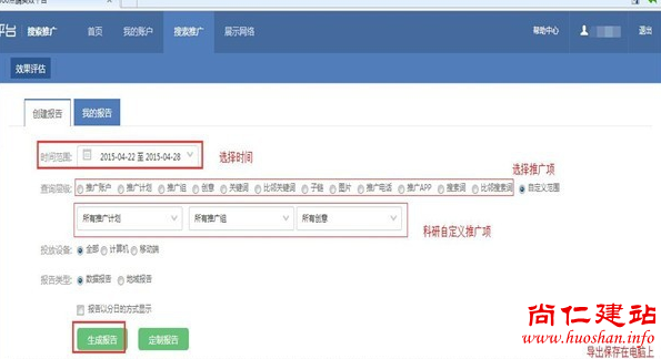 1.最后就是查找账户数据,进行账户分析,要时常关注账户数据报告,才能更好地调整账户,如下图,选择【搜索推广】,点击【效果评估】。根据自己需要查找数据的时间,点击选择时间,还可以直接选择需要查找的栏目组,或者自定义栏目,点击【生成报告】可直接查找数据报告,如果想保存下来,点击右边【导出数据】,可直接下载在电脑上。