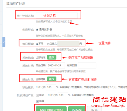 注意:计划名称最多是16个汉字或是32个字母,推广地区要根据自己的产品使用群体或是业务范围,推广时间要保持在有在线客服的情况下。