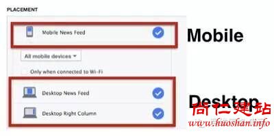 广告营销的最佳策略是建立高度分段的广告,Facebook新闻Feed和右栏广告在投放的时候,可选择针对桌面端和移动端不同渠道投放,选择不同的目标受众。