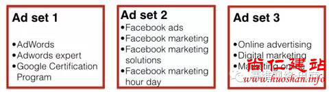同一组的广告将呈现不同的利益驱动,而一般规则是,您应该将目标利益根据不同主题进行分组,然后为每个主题创建一组广告。假如您的目标利益是Adwords、AdWords expert、谷歌认证程序(Google Certification Program)、Facebook广告、Facebook营销、Facebook营销解决方案、Facebook marketing hour day、在线广告、数字营销、市场营销等,您可以选择感兴趣的主题,设计成组的广告,如小图所示: