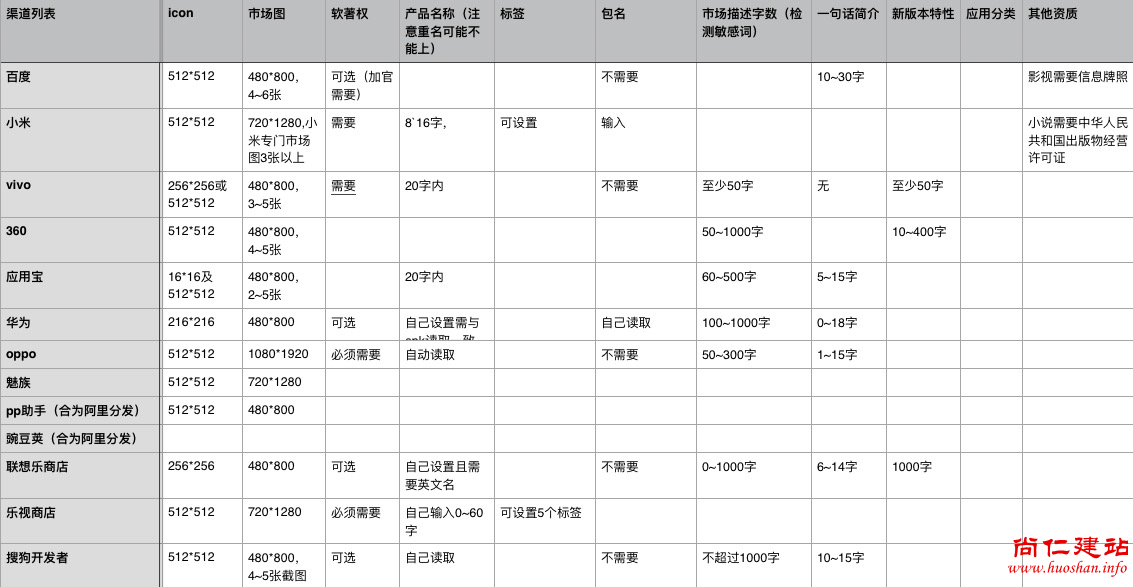 然后你要准备icon、市场截图、各个不同渠道名的包、市场说明、新版本说明、一句话介绍、应用关键词标签、软著权等各种资质。