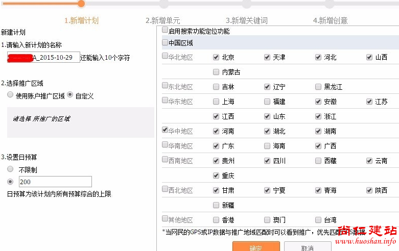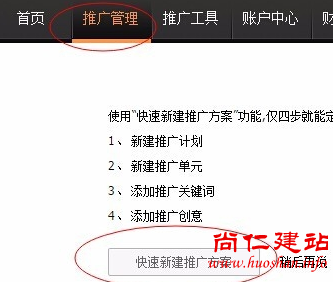 1.登陆账户后台,点击推广管理,然后选择“快速新建推广方案”,进入下一步设置推广计划的地域和预算等,计划名称随意,冰山的习惯是“项目名称+A+日期”这样的格式,这样的好处是通过ABC区分不同的计划目标,A为主,B为辅助计划,C是测试等等;日期则是创建计划的日期,这样方便以后做A/B推广效果测试的时候好区分。