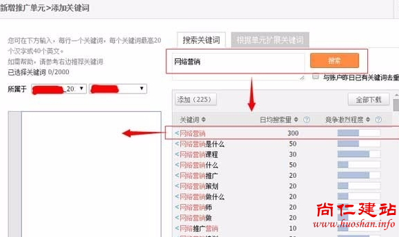 1. 点击下一步之后进入新建关键词环节,如下图,右侧部分是提供关键词数据参考的地方,我们可以在搜索框中输入主营业务的关键词,点击搜索之后下方就会出现这个词相关的一些长尾以及他们的搜索量和竞争情况,这些数据都是供参考,尤其是搜索量数据,是一个平均值,并不准确,我们只需要通过这个系统工具找到要添加的词和这个词的大概流量就好。点击关键词左侧的小箭头可以把它添加到左侧的空白栏中,推荐添加5-20个左右的关键词到单元中,匹配模式推荐使用“短语”。