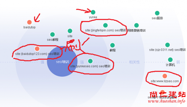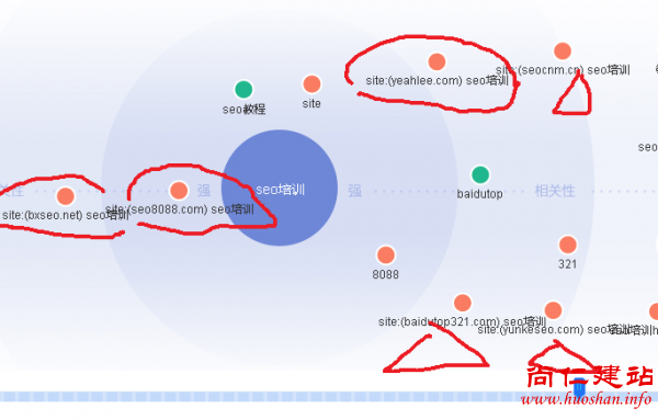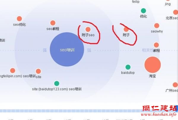 圆形圈起来的,在图谱中存在的时间比较短,来回动一下横条的时间表查看,这几个站没有任何排名。而三角形指出来的几个域名却长期存在于需求图谱中,拉动横条可以看到这几个域名虽然位置变动了,但是依然存在靠中心的位置,这几个站一直排在SEO培训首页。