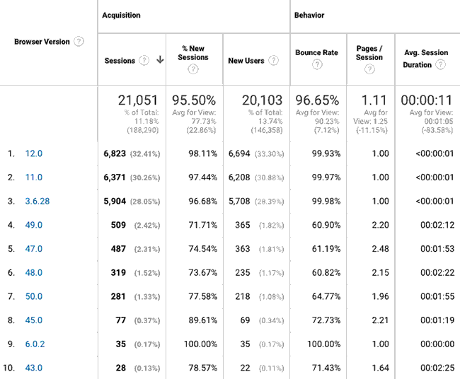 现在Firefox已经是版本53了,版本11、12早就没人用了,但流量统计显示大量使用firefox 11/12,甚至还有3的访问,99.9%跳出率,停留时间低于1秒。看来由于某种原因,陷害人使用的软件模仿的是很旧版本的几个浏览器。