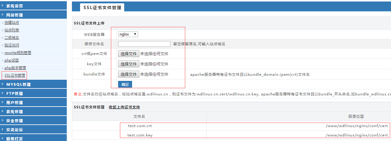 A、首先申请》下载》解压SSL证书到本地电脑。然后登陆wdcp控制面板,点网站管理》SSL证书管理》上传证书,证书名称与建立的站点名一致,如图:
