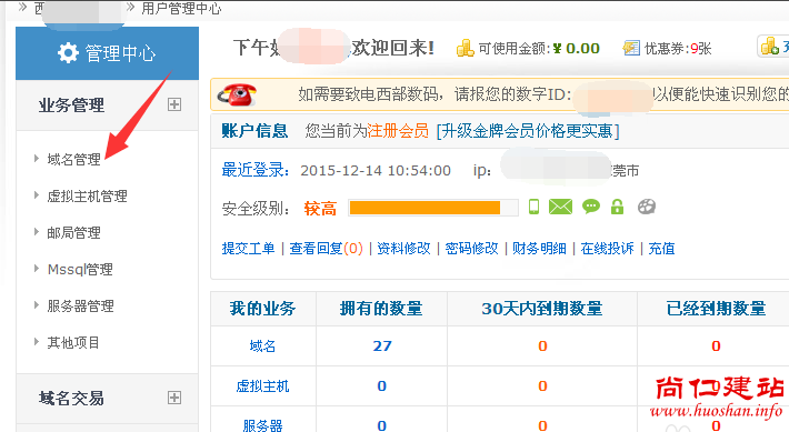 2.在我们进入到域名的管理平台并登陆后,我们在后页面中找到且点击打开”域名管理“这一项。