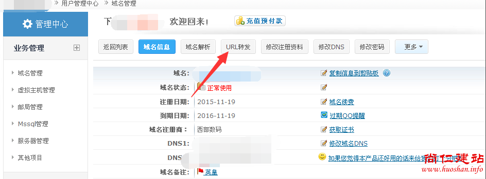 4.接着,在我们点击管理选项后,即进入到该域名的设置页面,这里我们可以找到”URL转发“这一选项功能,点击它。