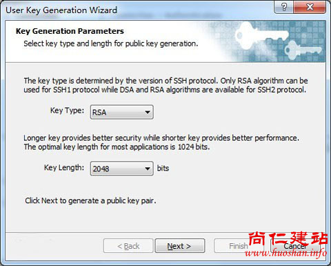 弹出“User Key Generation Wizard”对话框,在“Key Type”项选择“RSA”公钥加密算法,“Key Length”选择为“2048”位密钥长度,如下图: