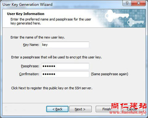 继续下一步,在“Key Name”中输入Key的文件名称,我这里为“key”;在“Passphrase”处输入一个密码用于加密私钥,并再次输入密码确认,如下图: