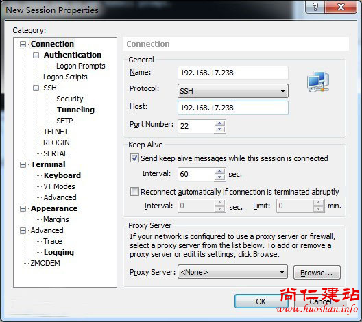打开Xshell,点击“New”按钮,弹出“New Session Properties”对话框,在“Connection”栏目中,输入刚刚配置好公钥(Public Key)的IP地址和端口,如下图所示: