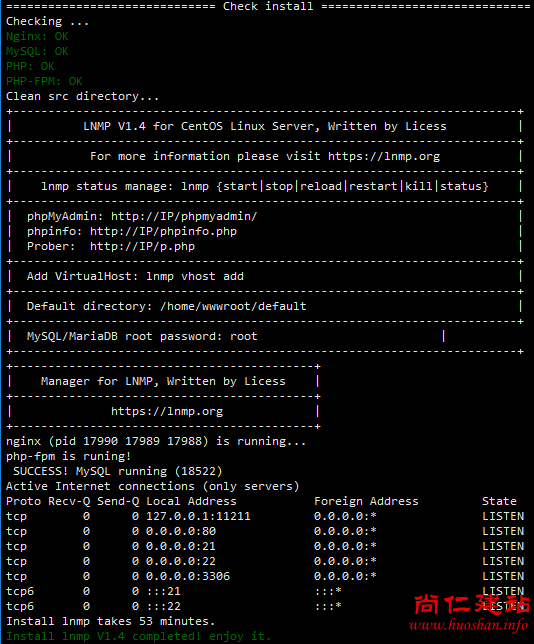 并且Nginx、MySQL、PHP都是running,80和3306端口都存在,并提示安装使用的时间及Install lnmp V1.4 completed! enjoy it.的话,说明已经安装成功。