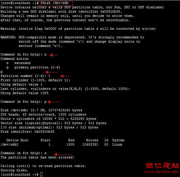 第二步:格式化硬盘 命令: fdisk /dev/sdb