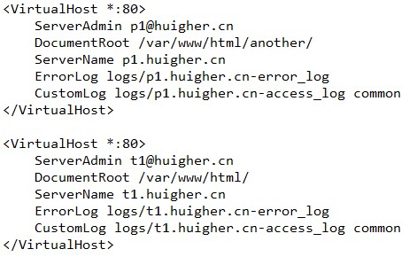 3、 最后加入以下代码,告知 Apache 合法的网站主机头,这个代码块根据实际情况修改内容,该实例中加入了两个网站,分别是 p1.huigher.cn 和 t1.huigher.cn。