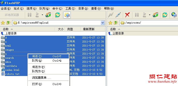 将Upload 目录下的全部文件和目录,通过FTP软件(本文使用FlashFXP)以二进制方式上传到空间或服务器的网站根目录(标识符为“/”,如果不清楚网站根目录所在位置,可以咨询您的空间商),本文网站根目录是:D:/empirecms。