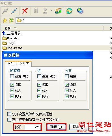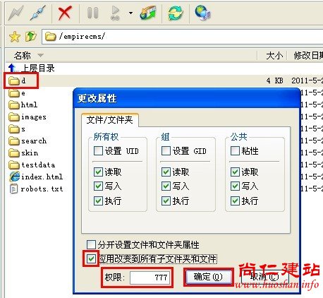 目录上传完毕后,设置目录属性,使文件可以被 EmpireCMS 正确读写。