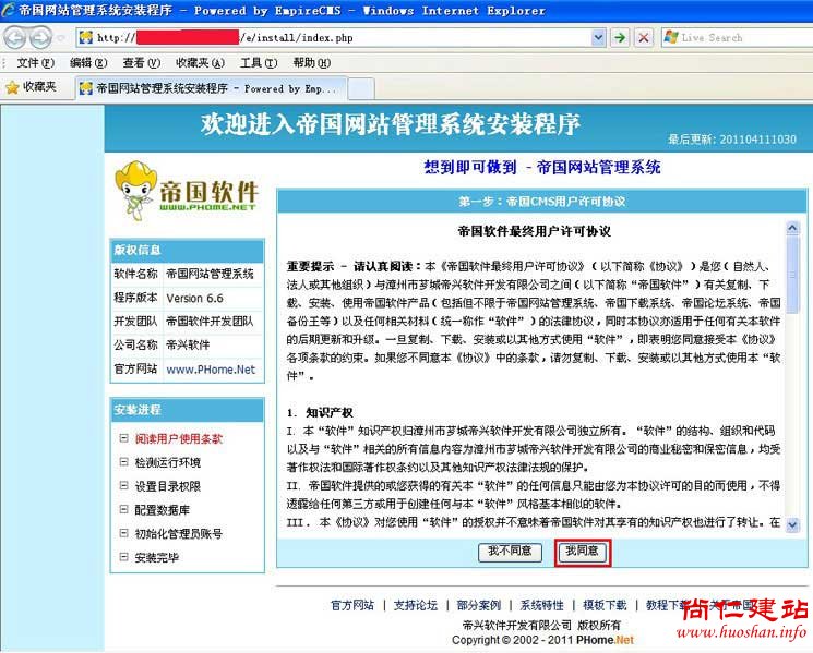 出现如下图所示的帝国CMS安装界面,页面左侧导航栏分别显示版权信息和当前安装进程;页面中部显示的是帝国CMS使用许可协议,