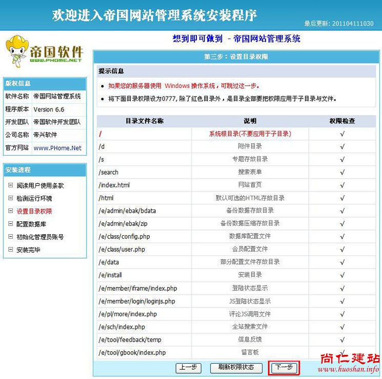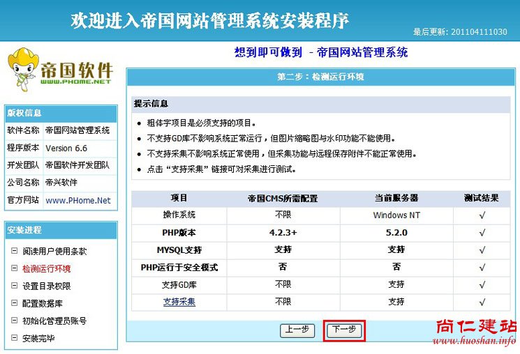 检测成功的运行环境和目录权限项目均为√显示,如下图所示,可以单击【下一步】按钮: