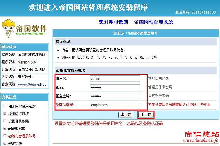系统自动建立数据表成功后,就进入创建网站后台管理员账号信息界面,如下图所示:
