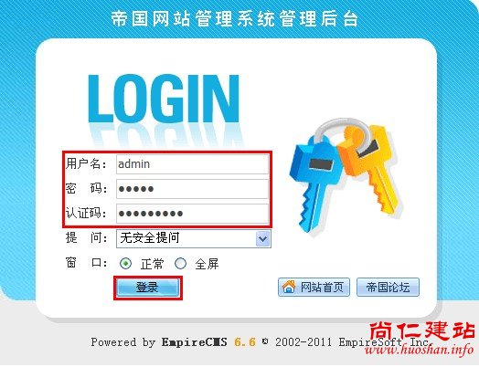 进入网站后台登陆界面,输入安装时设置好管理员账号用户名、密码和认证码,单击【登录】按钮。