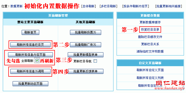 依次单击【恢复栏目目录】按钮、【刷新所有信息栏目页】按钮、