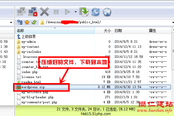 2.借用ftp工具:flashfxp下载压缩好的网站文件。用flashfxp登录你的网站目录,找到刚压缩好的文件,点击右键,传输按钮,下载到本地。