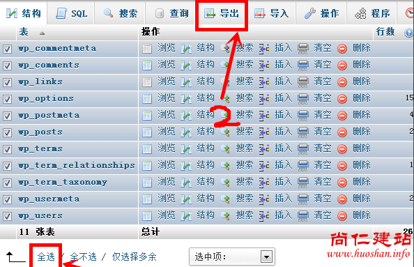 2.在相应数据里,点击全选,点“导出”按钮,将旧数据库里的所有数据备份导出到本地。