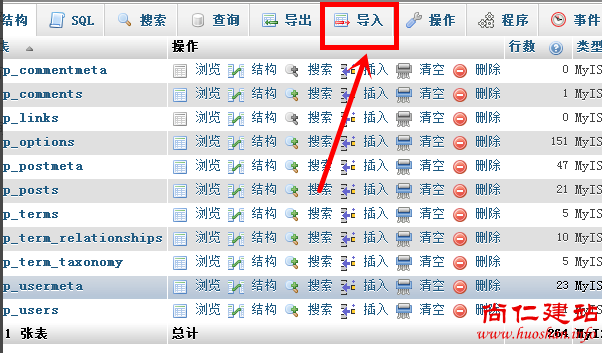 3.登录新空间控制面板,进入数据库管理,登录phpmyadmin管理,进入相应数据库后点击导入按钮。