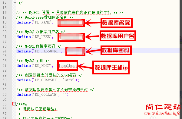 6.编辑wp-config.php,代码在17行开始,替换数据库的名称、MySQL数据库用户名、MySQL数据库密码、MySQL主机为当前所用数据库信息。完成修改后,数据库转移的工作顺利完成。