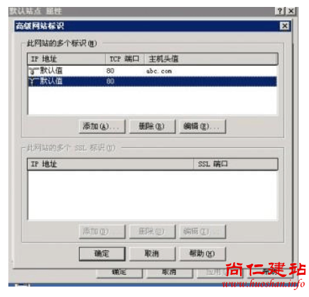 点开“高级网站标识”对话框后,会看到主机头值为空的标识,点“删除”,将它删除即可(如下图)。