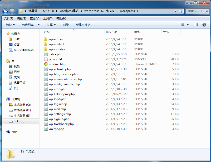 在wordpress官网下载最新建站程序,下载下来的是一个安装包,然后将安装包解压一下我们就可以看到以下下这些文件如下图所示: