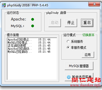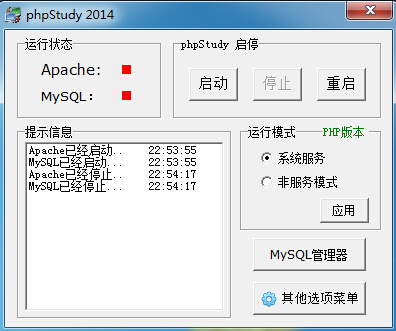 这个主要用相关软件工具来实现,这类软件工具在网上很多,在这里就用我常用的phpStudy来为大家讲解,个人觉得用它来配置本地服务器环境很方便。至于下载什么的我就不想多说了,直接百度一下phpStudy然后下载下来就可以了。下载好以后按步骤安装好,安装成功以后就打开软件我们就可以看到以下界面: