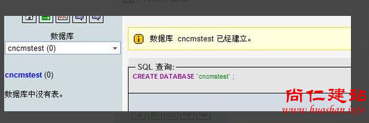 2.创建一个数据库,如下图,在php MyAdmin右边窗口中,填写数据库名称,点创建即可。 例如我们这里创建一个名字为:cncmstest 的数据库,建成功会有如下提示: