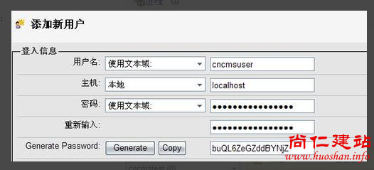 6.在该页面中,我们填写要创建的数据库用户名,该用户的访问范围,及密码。如上图,我们填写了用户名为:cncmsuser,该数据库用户只允许本机访问,主机一项选择本地;密码我们使用自动生成的,点下面的“Generate”会生成一个随机密码,然后点“Copy”会自动填写到密码框中。