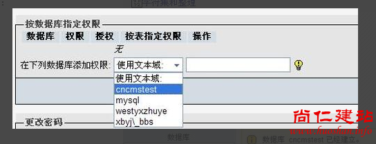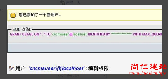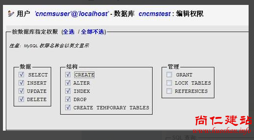 在数据库用户添加成功返回的页面中可以直接设置权限。这里我们选择按数据库指定权限:如上图,在数据库列表中选择我们刚刚创建的cncmstest,即会自动进入该数据库的权限设置页面。在上图的权限设置中,我们把“数据”、“结构”两列的权限全部选中,管理权限都不要选。点执行即可。