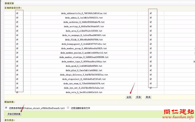 4. 安装完后,登陆后台,点击 系统管理 –> 数据库备份/还原 –> 数据还原,全选发现的备份文件,点击还原即可。注意:附加参数中的还原表结构信息不要勾选。