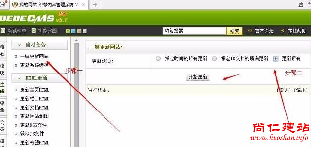 5. 这一步需进行缓存清理,点击后台的 生成 –> 更新系统缓存 –> 开始执行;系统缓存清除完成后,再一键更新网站。
