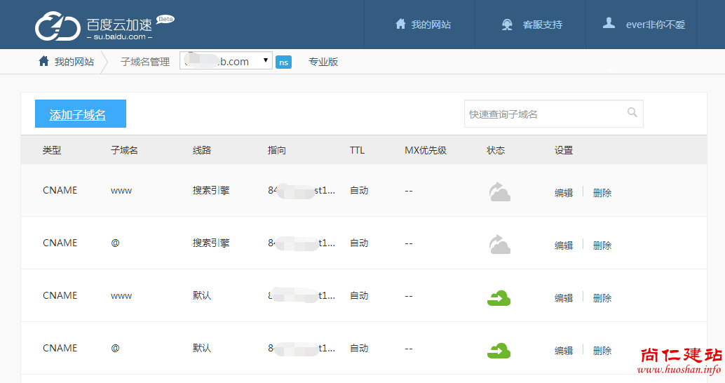 在域名提供商那里更换您的域名解析,将域名解析到新的IP上,这里使用百度云加速为例。