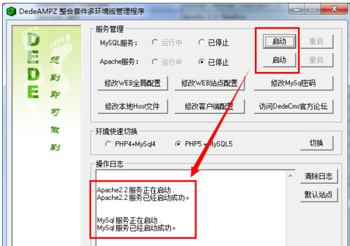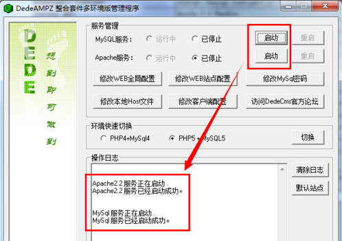 双击任务栏中的“DedeAMPZ管理”图标打开程序主界面,分别点击“MySql 启动”和“Apache 启动”按钮将这两个服务启动。