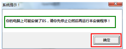 下载完成后,解压并进行安装,在弹出的安装界面中点击“安装”按钮,此时程序会自动对当前系统环境进行检测。如果弹出如图所示的“需要关闭IIS”的提示窗口时,需要暂时关闭IIS。具体方法请参考本文最后部分。