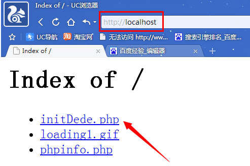 打开浏览器,输入“http://localhost”并按回车,如果界面有响应,表明搭建服务器成功。当然,我们可以点击“InitDede.pho”来升级到最新版本。