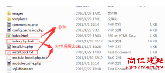 2.打开该文件夹,需要删除两个文件已经修改两个文件。删除install_lock.txt、index.html,修改index.php.bak、module-install.php.bak将其后缀.bak去掉即可。