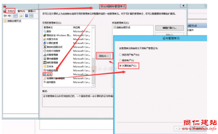 开始>运行>MMC。再依次点击“文件”>“添加或删除管理单元”>“证书”>“计算机账户”>“下一步”>“添加”。