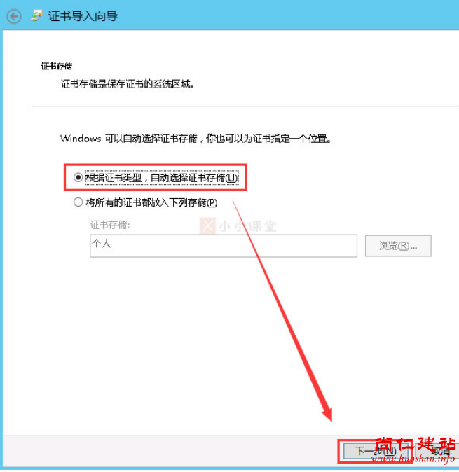 打开之后,选择下一步,勾选“根据证书类型,自动选择证书存储”,然后点击下一步。